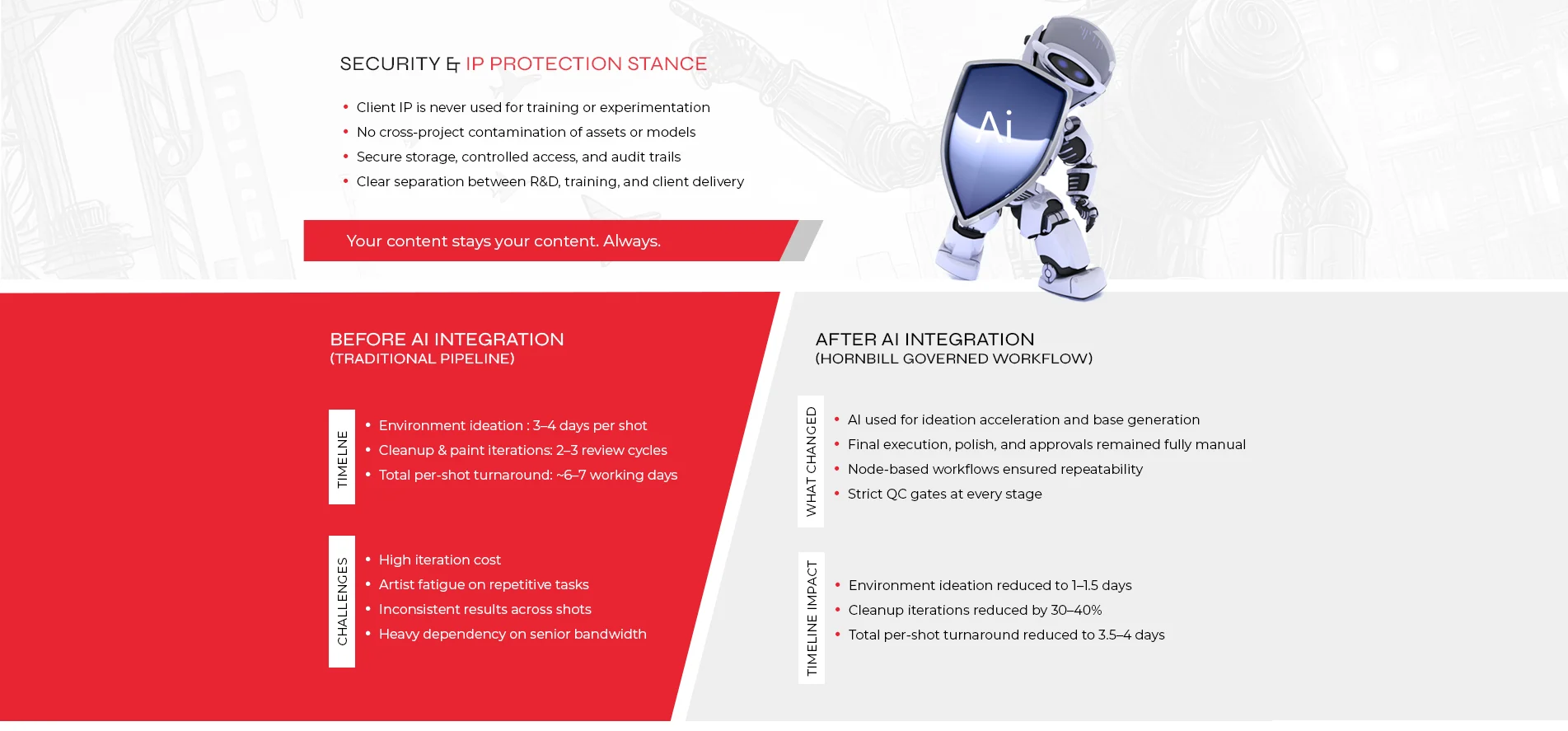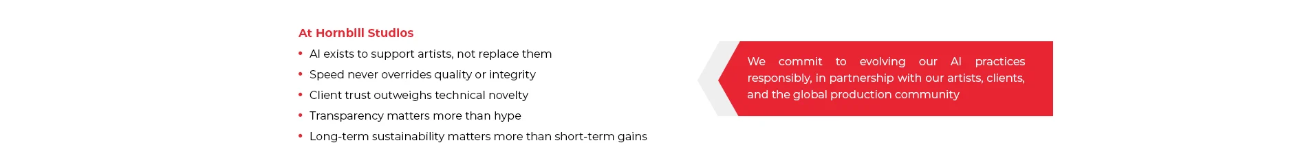 At Hornbill Studios, AI is not an experiment or a shortcut. It is a carefully governed production tool, integrated into real Animation & VFX pipelines under strict human supervision.